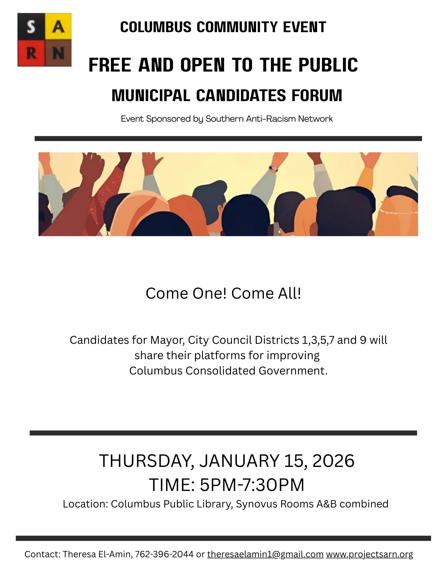Next candidates forum sponsored by SARN will be Thursday, April 9, South Columbus Public Library, 4pm-5:30pm. Start time might change to 5:30pm, if South Columbus changes its late night from Wednesday to Thursday.